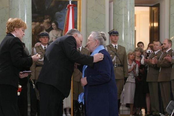 Prezydent Lech Kaczyński dekoruje Annę Walentynowicz Orderem Orła Białego – najwyższym polskim odznaczeniem. Link Źródło Wikimedia Commons.