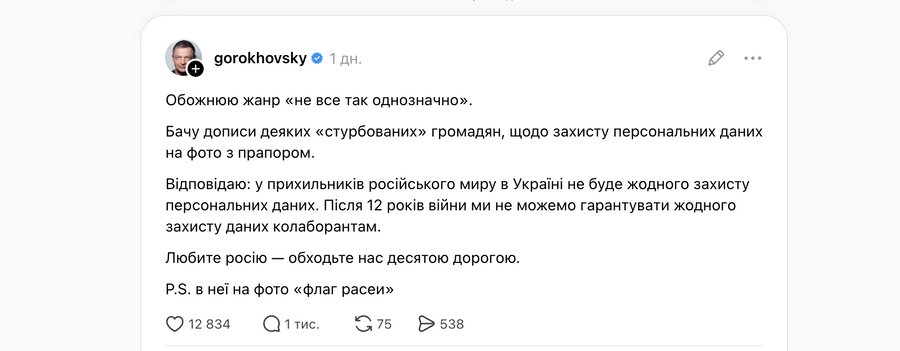 W najnowszym wpisie w mediach społecznościowych Ołeh Horochowski odniósł się do całej sytuacji i przyznał, że jego reakcja była impulsywna. Napisał, że po wielu latach wojny rosyjski trójkolor wywołuje w nim silne emocje, dlatego zareagował szybko, nie analizując dokładnie sytuacji. Podkreślił jednak, że jego negatywny stosunek do rosyjskiej symboliki nie zmienił się.