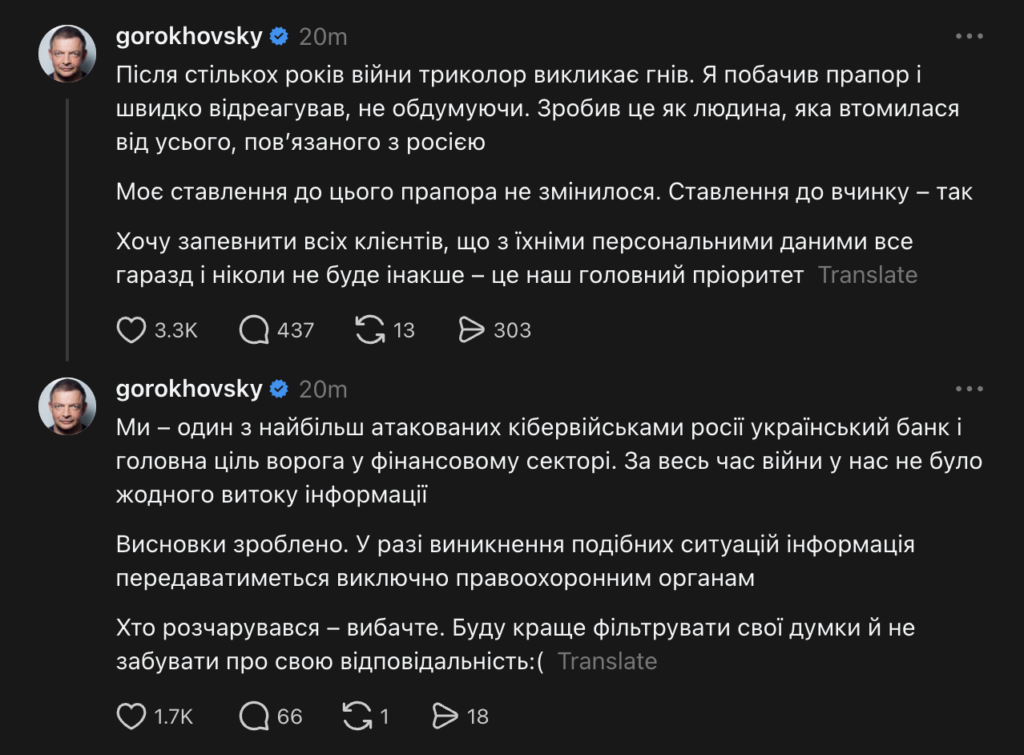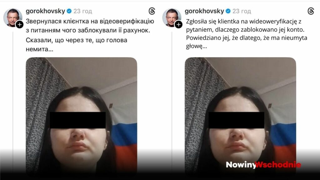 Wokół ukraińskiego banku monobank wybuchła dyskusja po tym, jak jedna z klientek poinformowała o zablokowaniu jej konta po przejściu procedury wideoweryfikacji. Sprawa stała się głośna po wpisie współzałożyciela banku, Oleha Horochowskiego (Gorokhovsky), opublikowanym w serwisie Threads. (Red.: wpis został już usunięty. Zrzut ekranu publikujemy poniżej wraz z tłumaczeniem na język polski).